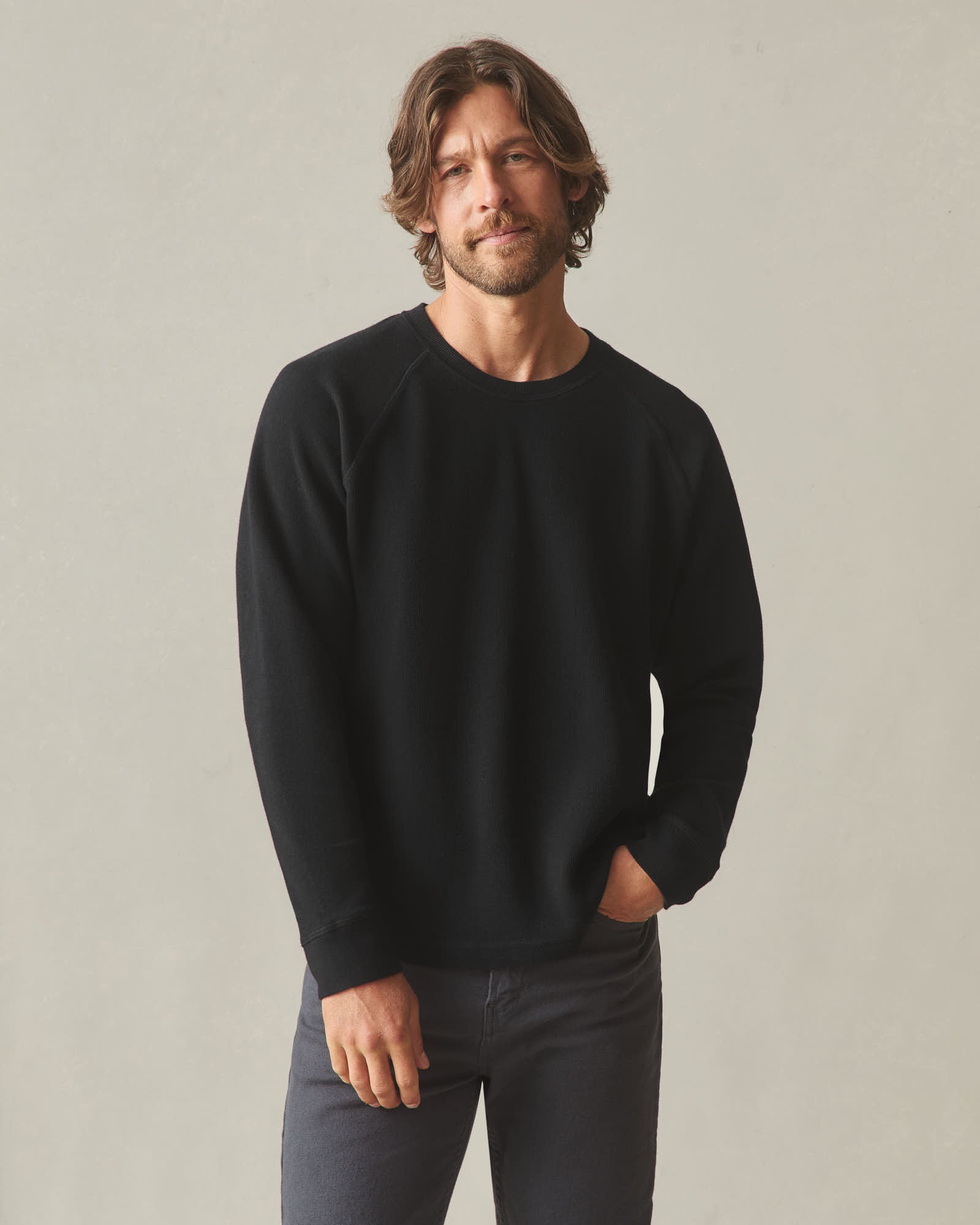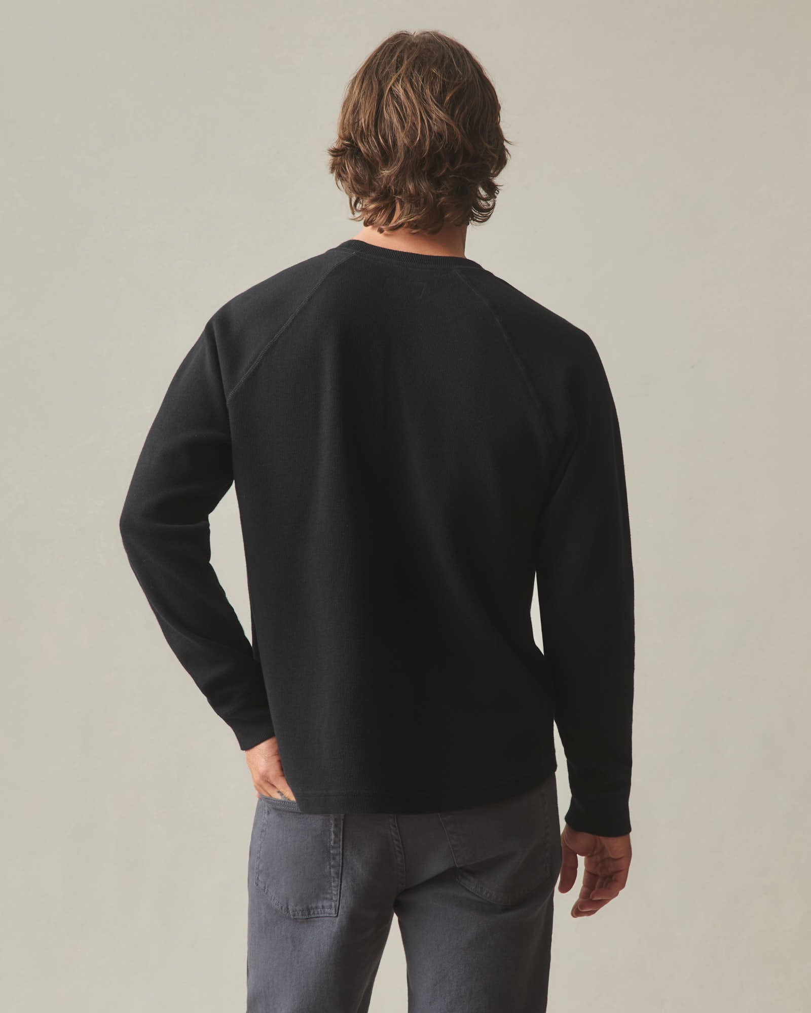 This is our take on a better sweater. Clean on the outside. Soft on the inside. Made from 100% cotton with a French rib knit that adds texture without weight. Now updated with raglan sleeves. which add ease through the shoulders without sacrificing structure. Custom yarn-dyed taping at the neck for a stronger finish. Looks sharp. Feels easy.